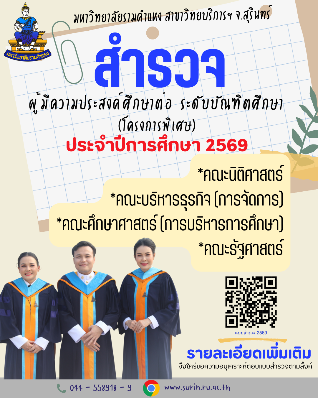 เพิ่มโอกาสในการเรียน ป.ตรี นิเทศศาสตร์ x ภาพยนตร์ จบภายใน 2 ปี 8 เดือน แบบไม่ไกลจากภูมิลำเนาของท่าน คณะสื่อสารมวลชน มหาวิทยาลัยรามคำแหง สำรวจความต้องการศึกษาระดับปริญญาตรี โครงการพิเศษสาขาวิชานิเทศศาสตร์และสื่อดิจิทัล (วิชาโทภาพยนตร์ฯ) ส่วนภูมิภาค โดยแบบฟอร์มการสำรวจนี้ คณะสื่อสารมวลชน มีความตั้งใจจะนำข้อมูลเบื้องต้นไปดำเนินการหลักสูตรภายใต้โครงการพิเศษ ที่สาขาวิทยบริการเฉลิมพระเกียรติ ของมหาวิทยาลัยรามคำแหง ในปีการศึกษา 2567 เป็นต้นไป