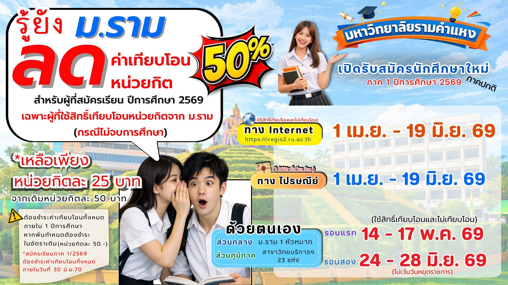ข่าวระดับปริญญาตรี ผู้ดูแลระบบ ข่าวประชาสัมพันธ์ระดับปริญญาตรี 27 กุมภาพันธ์ 2569 ฮิต: 27 ม.รามคำแหง ลดค่าเทียบโอนให้ 50% เนื้อหาก่อนหน้า: ข้อปฏิบัติในการสอบไล่ ก่อนหน้า เนื้อหาถัดไป: บรรยายสรุป วันเสาร์-อาทิตย์ วันที่ 13 - 14 ธันวาคม 2568 ต่อไป