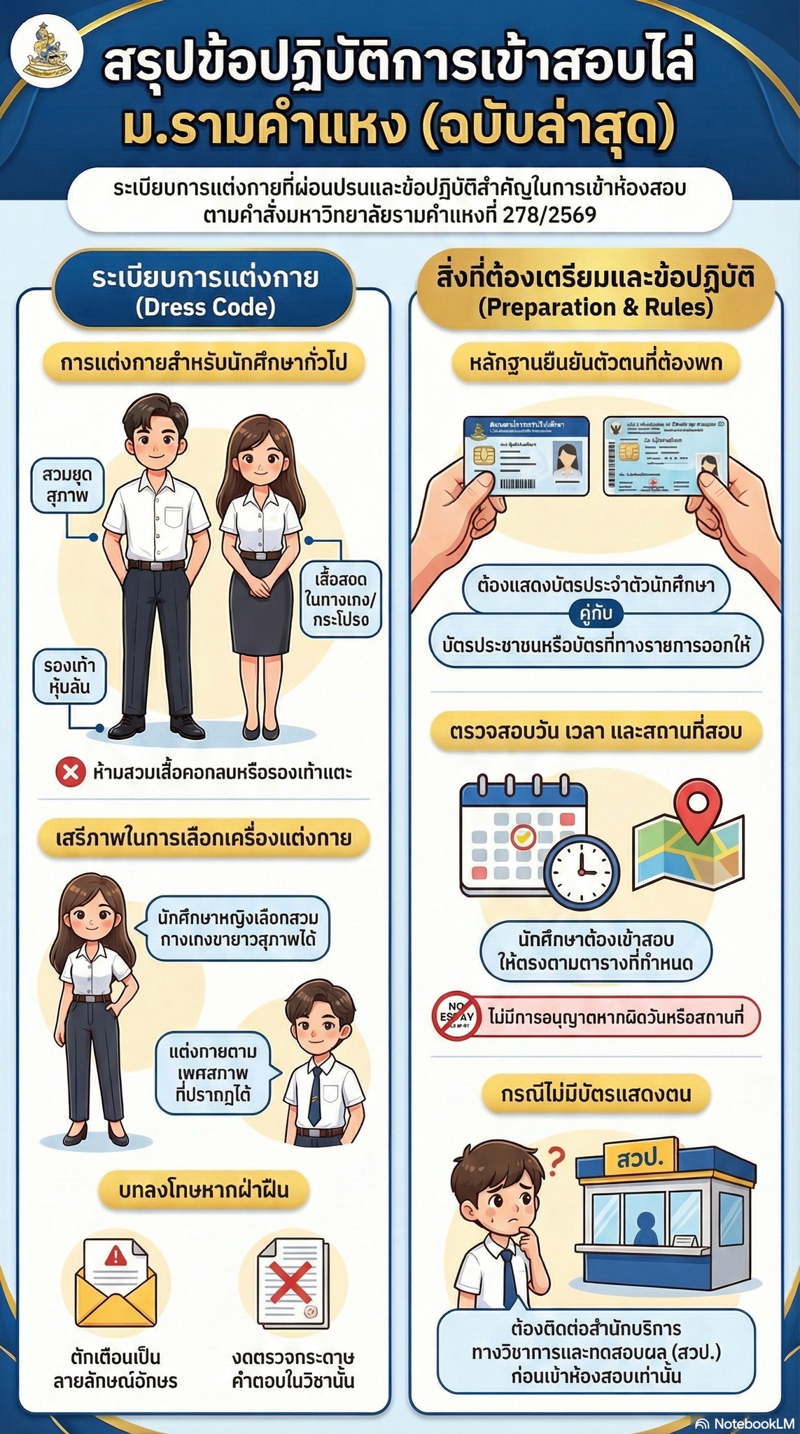 ข่าวระดับปริญญาตรี ผู้ดูแลระบบ ข่าวประชาสัมพันธ์ระดับปริญญาตรี 02 มีนาคม 2569 ฮิต: 17 คำสั่งมหาวิทยาลัยรามคำแหง ที่ 278/2569 เรื่อง ข้อปฏิบัติในการสอบไล่ สำหรับนักศึกษาระดับปริญญาตรี เนื้อหาถัดไป: ข้อปฏิบัติในการสอบไล่ ต่อไป